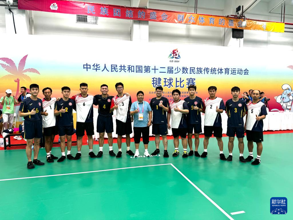 11月24日,第十二屆全國(guó)少數(shù)民族傳統(tǒng)體育運(yùn)動(dòng)會(huì)毽球男子三人小組賽在海南省三亞市舉行,圖為天津隊(duì)和廣西隊(duì)比賽現(xiàn)場(chǎng)。新華社記者 晉美多吉 攝