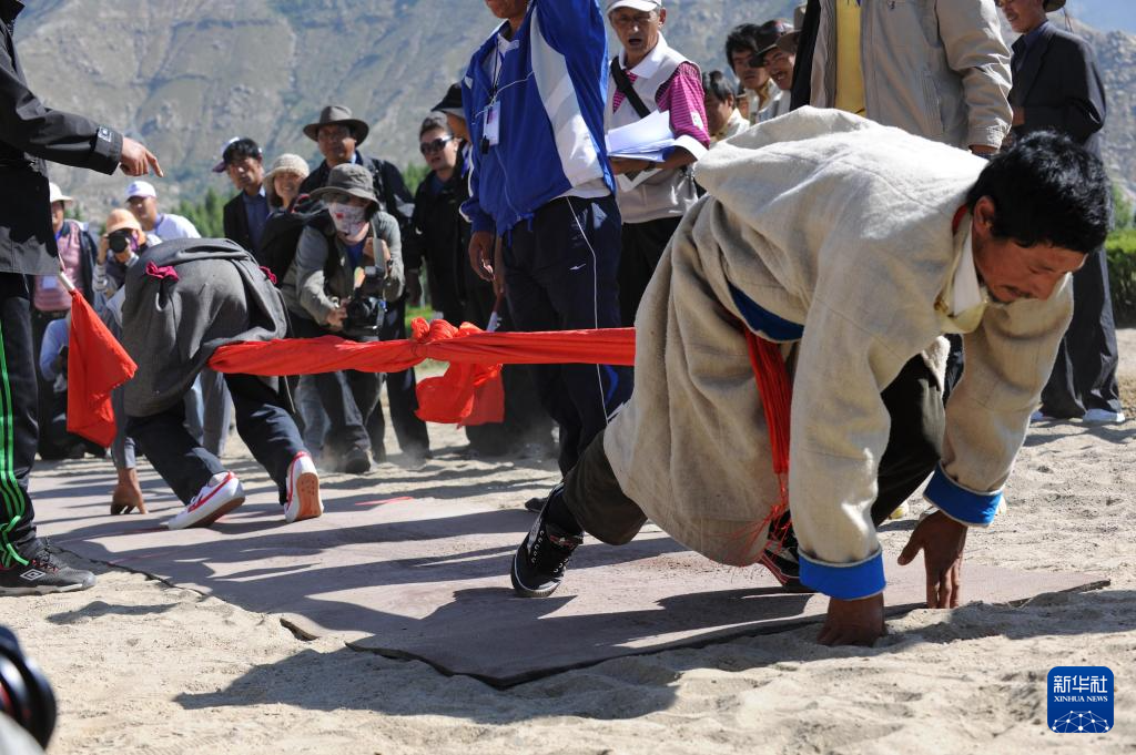 押加是一項(xiàng)在西藏地區(qū)廣為流傳的運(yùn)動(dòng),也被稱為“大象拔河”。在比賽中,選手需四肢著地,背對(duì)背彼此發(fā)力,直到一方將中間的墜條拉過(guò)自己一側(cè)的決勝線。