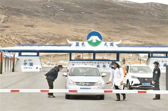 為當(dāng)雄縣羊八井藍(lán)色天國(guó)對(duì)進(jìn)出車輛進(jìn)行消毒安檢。(本組圖片由拉薩融媒視覺(jué)組攝)