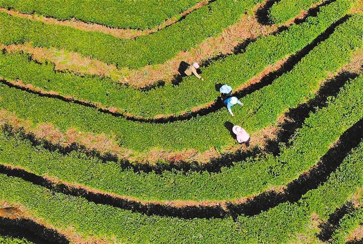 氣溫回暖,蟄伏了一個(gè)冬天的春茶早已迫不及待地吐出新綠。一片片小小的茶葉是村民手中的“金葉子”,一壟壟整齊的茶園成為當(dāng)?shù)厝罕姷摹熬蹖毰琛?,它們撐起了農(nóng)民增收、農(nóng)村富裕、脫貧攻堅(jiān)的一方天地。
