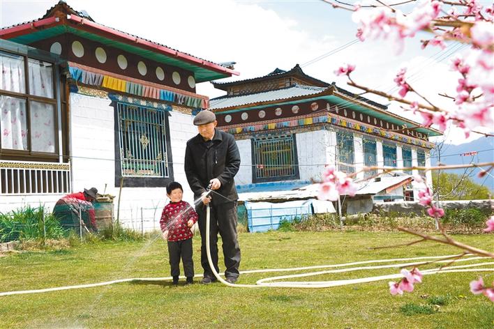 圖為巴宜區(qū)米瑞鄉(xiāng)通麥村村民扎西格勒在自家庭院給草坪灑水。見習(xí)記者 胡文 攝