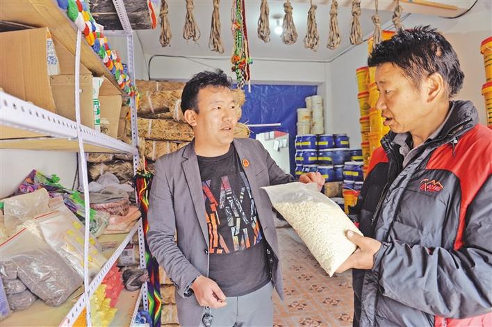 巴青縣雅安鎮(zhèn)產(chǎn)業(yè)合作社社員在給鎮(zhèn)黨委書(shū)記遲拉(左)介紹特色產(chǎn)品銷售情況。