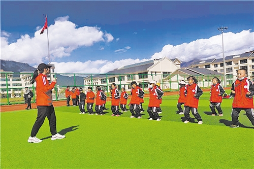 西藏林芝市巴宜區(qū)八一鎮(zhèn)團結(jié)小學(xué)操場上,來自廣東的援藏教師正在向?qū)W生教授跆拳道。經(jīng)濟日報 記者 龐彩霞