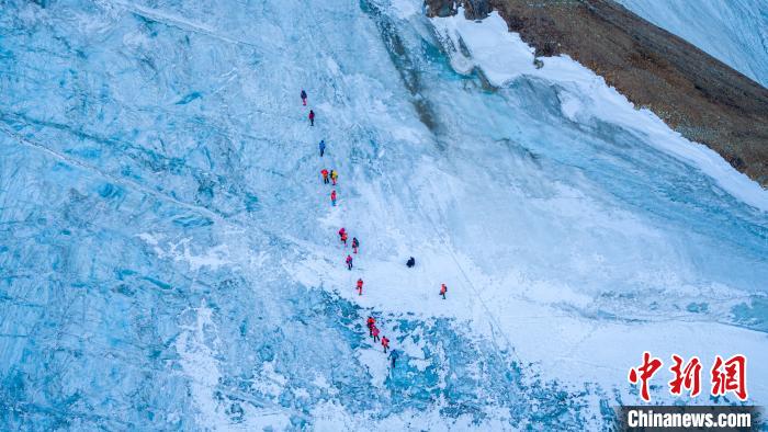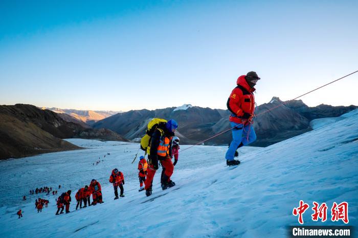 圖為第三極攀登者2020中國(guó)企業(yè)家冰川挑戰(zhàn)賽參賽者在登山途中?!‘?dāng)雄縣委宣傳部供圖