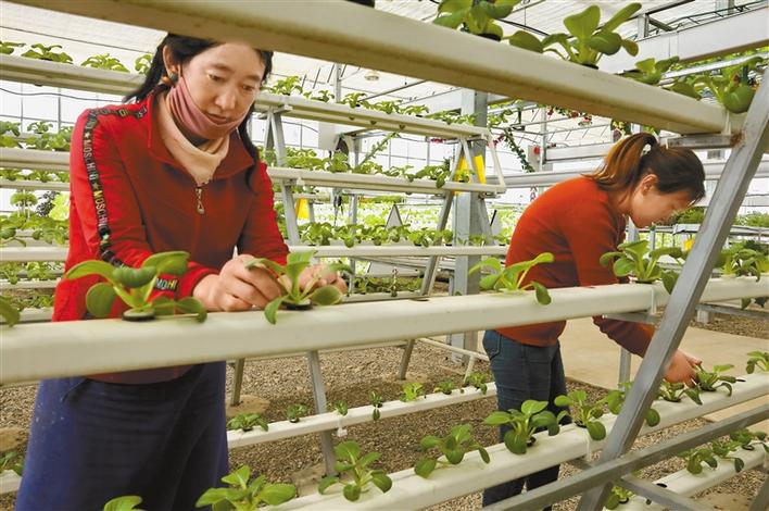 圖為園區(qū)務(wù)工人員在日光溫室內(nèi)打理蔬菜秧苗。記者 唐斌 洛桑 攝