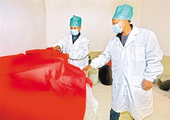 圖為山南市隆子縣扎日鄉(xiāng)藏白酒加工廠工作人員在查看儲藏的白酒。記者 洛桑 群培 攝