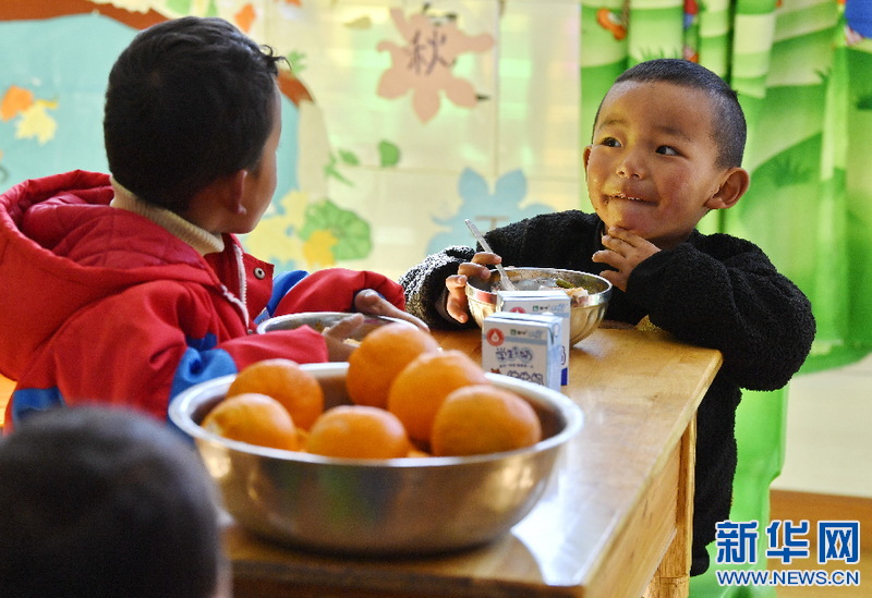 西藏山南市貢嘎縣吉雄鎮(zhèn)紅星社區(qū)雙語幼兒園的孩子們吃午餐(11月25日攝)。新華社記者 張汝鋒 攝