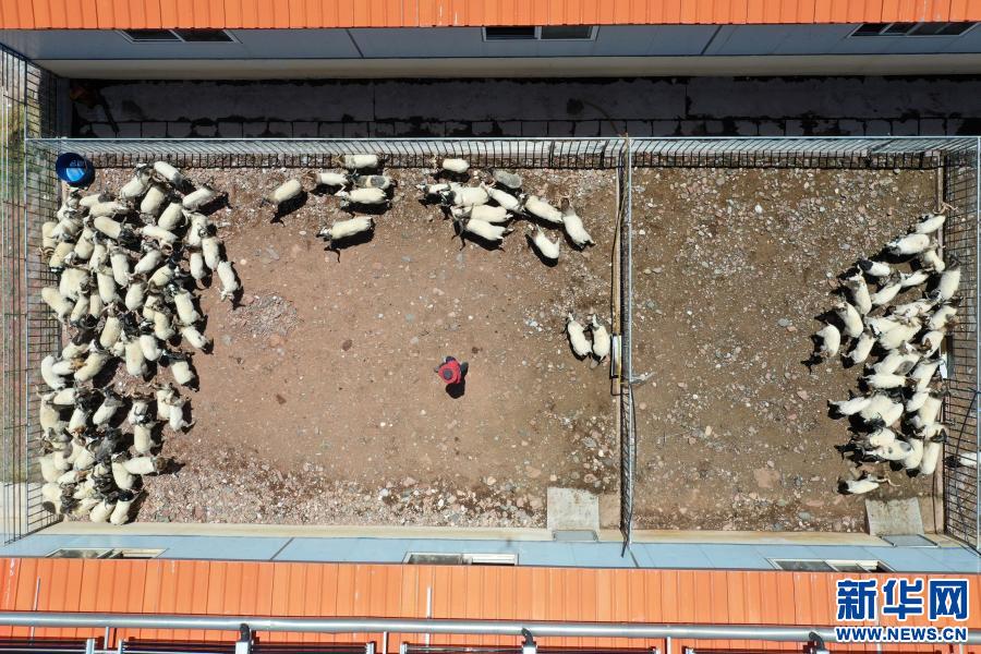 在西藏昌都市貢覺縣莫洛鎮(zhèn)阿旺綿羊繁育基地,阿果村村民色秋在查看綿羊的生長情況(5月2日攝,無人機(jī)照片)。2016年,色秋來到阿旺綿羊繁育基地打工,很快就學(xué)會(huì)了綿羊的養(yǎng)殖技術(shù),現(xiàn)已成為繁育基地的一把好手,月工資漲到了4400元。新華社記者 詹彥 攝