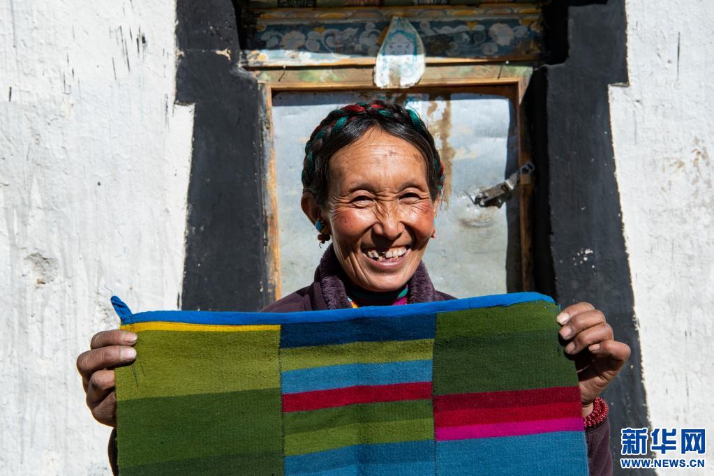 西藏自治區(qū)日喀則市定日縣扎西宗鄉(xiāng)托桑林村曾經(jīng)的建檔立卡貧困戶格桑展示自己編織的藏族傳統(tǒng)衣物裝飾邦典(2020年1月20日攝)。新華社記者 孫非 攝