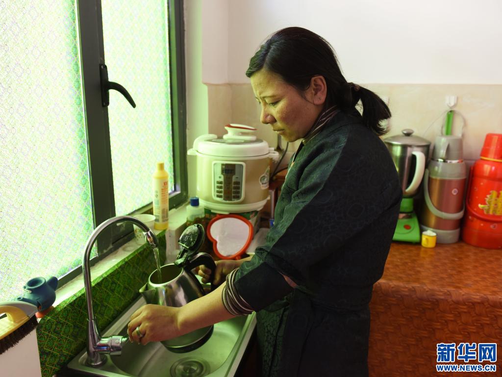森布日極高海拔生態(tài)搬遷安置點(diǎn)內(nèi),村民次仁卓嘎終于在家里用上了自來(lái)水(2020年1月12日攝)。新華社記者 田金文 攝