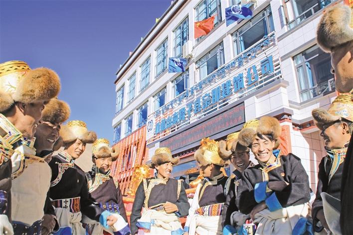 隆子縣宗那建筑公司新辦公樓前,農牧民務工人員慶祝企業(yè)喬遷。