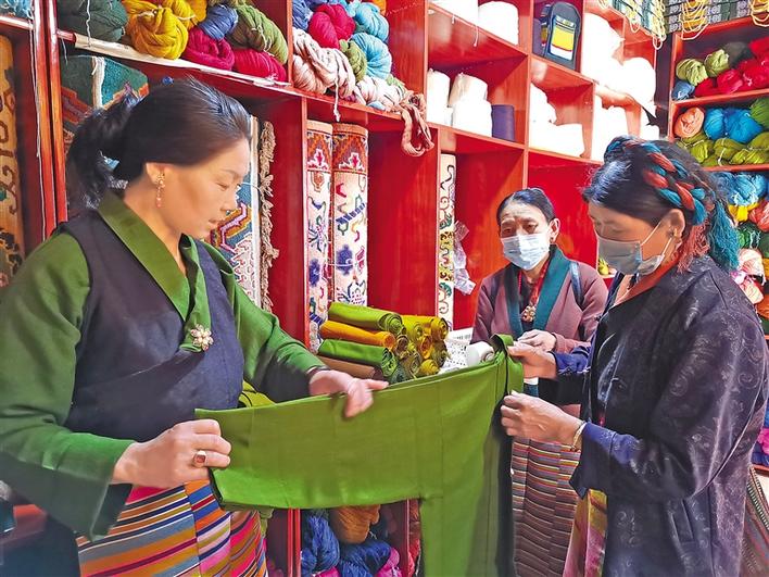日喀則市仁布縣德吉林鎮(zhèn)德旦康薩傳統(tǒng)手工業(yè)農牧民專業(yè)合作社負責人旦真愛人(左一)正在向顧客展示產品。記者 扎西頓珠 攝