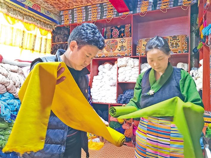 日喀則市仁布縣德吉林鎮(zhèn)德旦康薩傳統(tǒng)手工業(yè)農牧民專業(yè)合作社負責人旦真正在查看產品質量。記者 扎西頓珠 攝