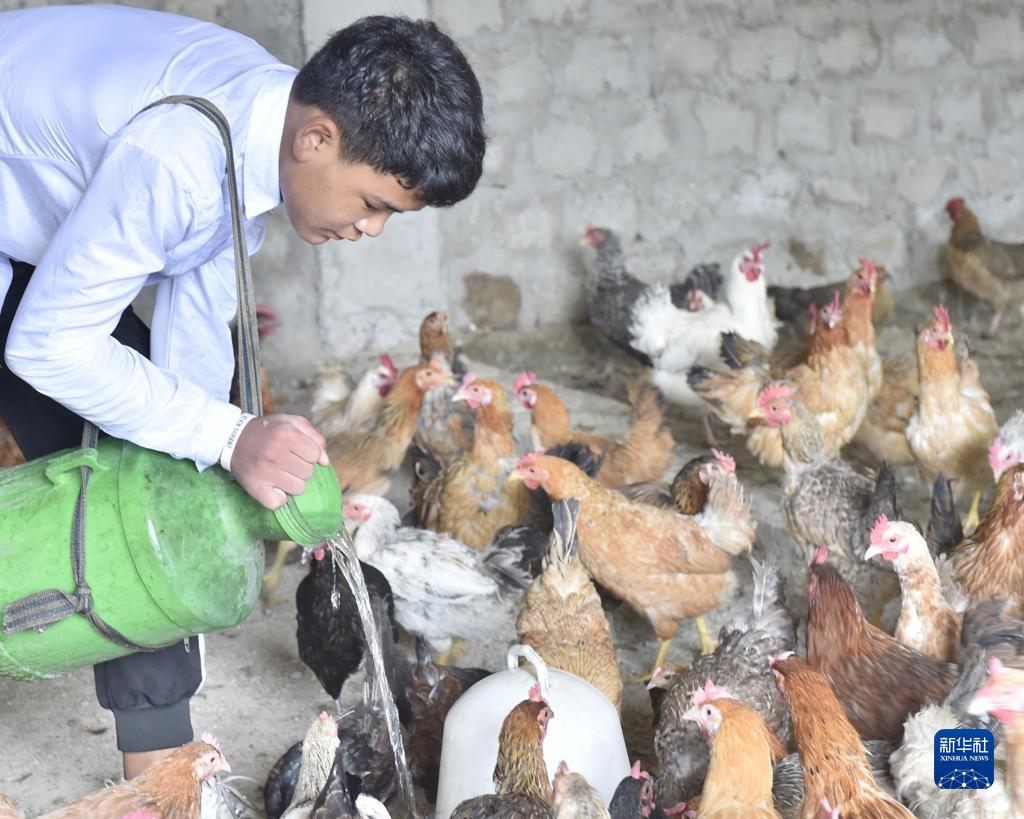 9月15日,西藏定結(jié)縣陳塘鎮(zhèn)養(yǎng)雞場工作人員扎旺給藏雞喂水。新華社發(fā)(索朗羅布 攝)