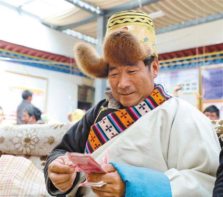 圖為崗西村群眾普瓊拿到合作社分紅時的情景。記者 張斌 通訊員 格桑羅布 攝