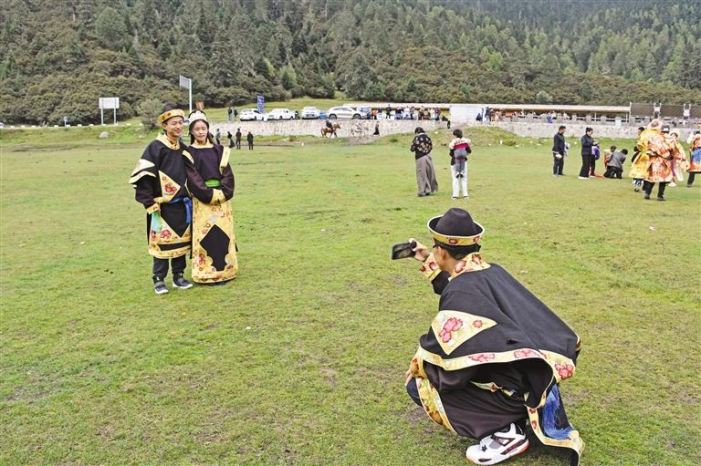 圖為來(lái)自廣東的游客身著工布服飾拍照留念。記者 胡文 攝
