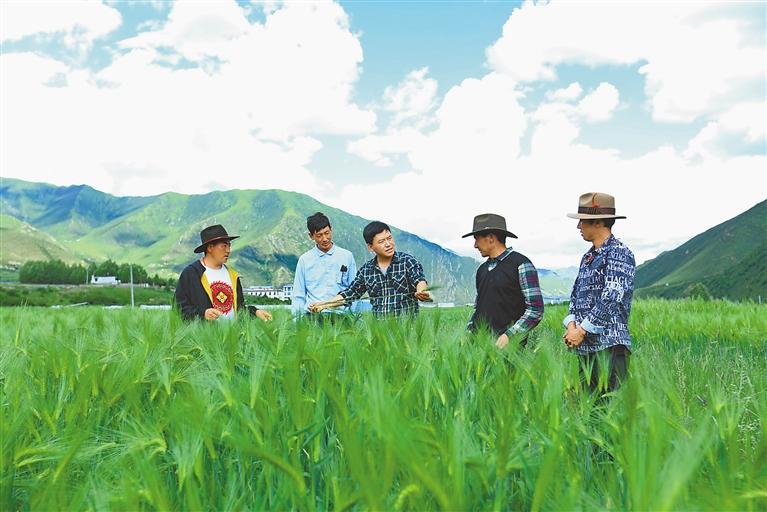 圖為拉薩市農(nóng)業(yè)農(nóng)村局技術(shù)人員深入田間地頭為群眾講解青稞新品種——“蘇拉青2號”種植技術(shù)。 記者 唐斌 攝
