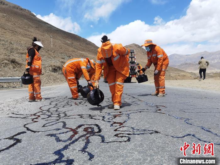 圖為在基層農(nóng)村公路,女護(hù)路員正熟練地開展瀝青灌縫作業(yè)。 西藏自治區(qū)交通運(yùn)輸廳供圖