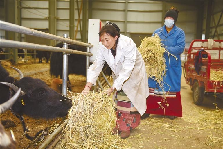 圖為在西藏娘亞牦牛養(yǎng)殖產(chǎn)業(yè)發(fā)展有限責(zé)任公司標(biāo)準(zhǔn)化養(yǎng)殖場(chǎng)內(nèi),員工給娘亞牦牛投喂飼草料。那曲采訪(fǎng)報(bào)道組 攝