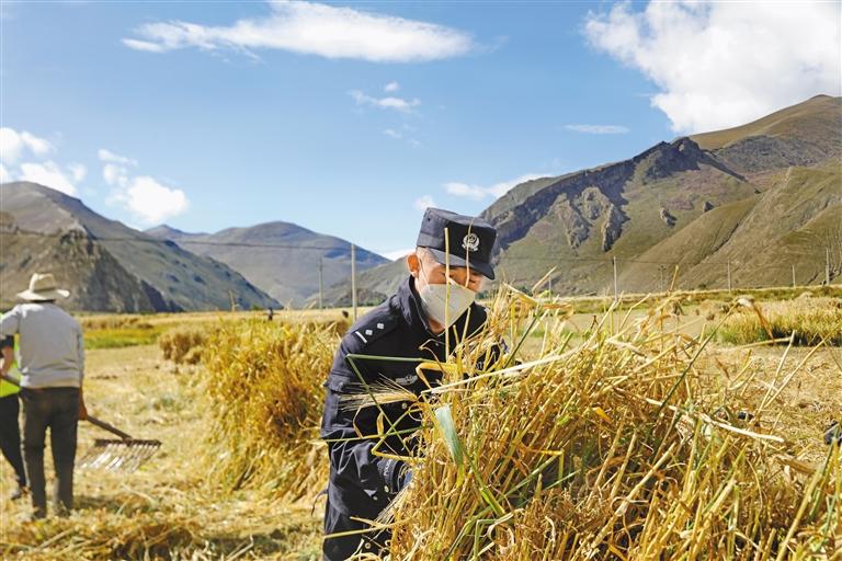 近日,日喀則市康馬縣公安局在統(tǒng)籌安排好工作的同時,組織民輔警志愿者深入南尼鄉(xiāng)楚嘎村田間地頭,幫助缺勞力家庭開展秋收。在豐收的田野上,民輔警志愿者分工明確,有的用背負式收割機收割,留下一排排青稞茬;有的將成熟的青稞捆扎,堆積成一排排青稞垛子,進行晾曬;有的忙于收集青稞穗,不浪費一粒糧食。