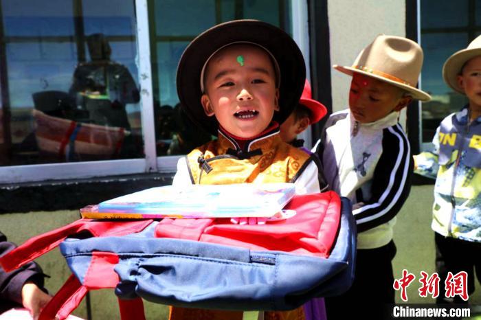 圖為普瑪江塘鄉(xiāng)小學(xué)生領(lǐng)取書(shū)包等學(xué)習(xí)用具?!±丝ㄗ涌h網(wǎng)信辦供圖
