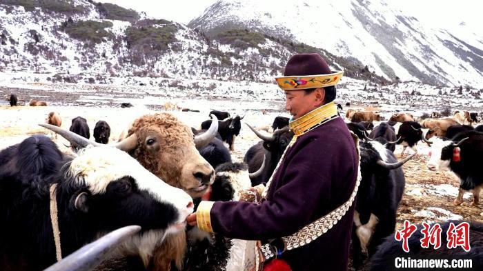 圖為角木那村民正在投喂牦牛?!“蜕G?攝