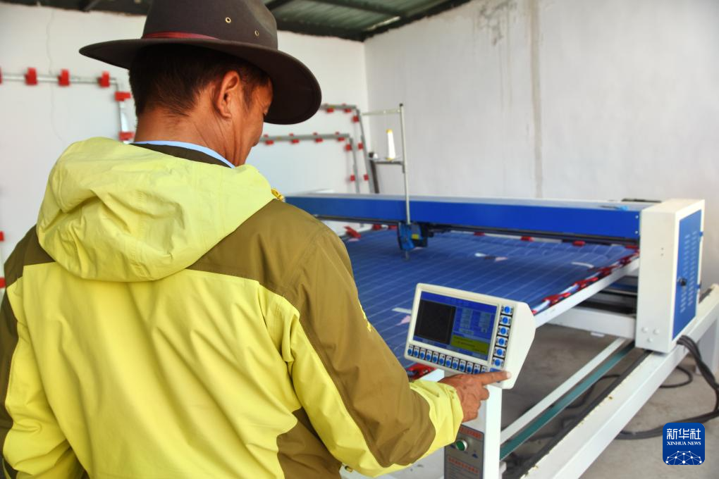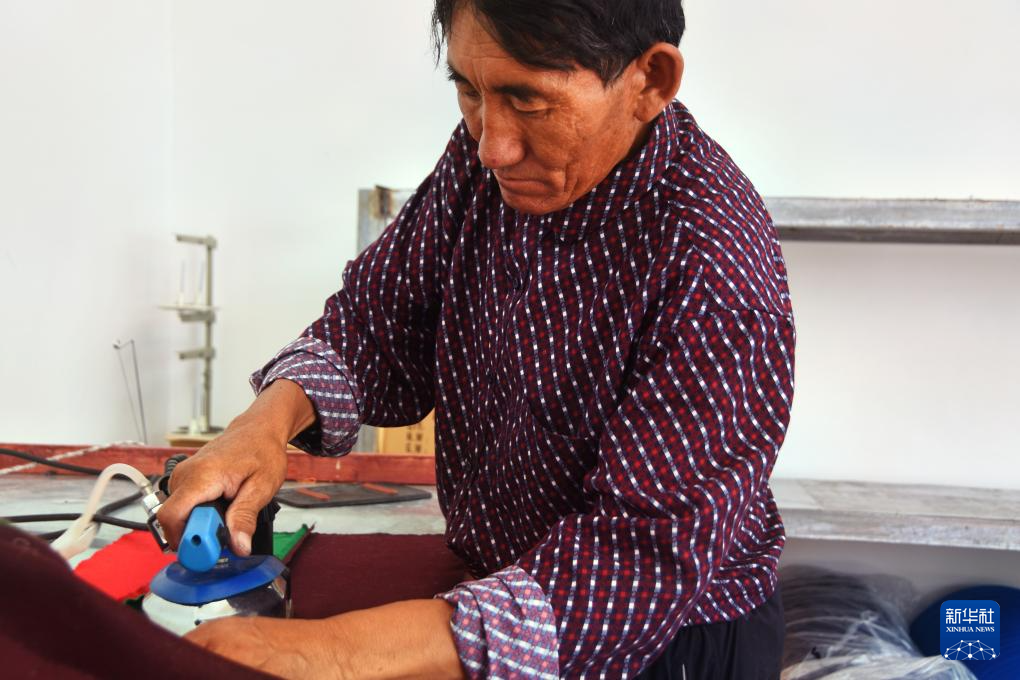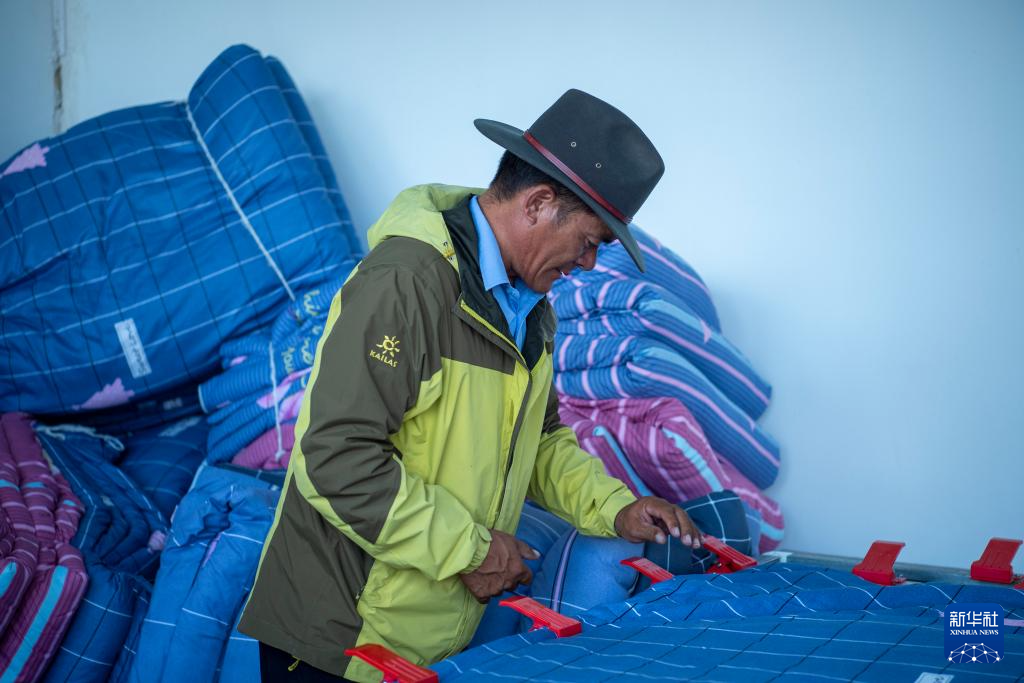 一位村民在縫制羊毛被(8月24日攝)。新華社發(fā)(旦增努布 攝)