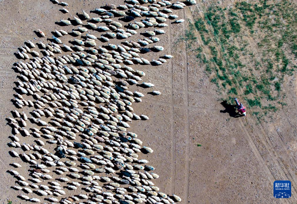 牧民在阿里地區(qū)日土縣班公湖畔放牧白絨山羊(無(wú)人機(jī)照片,9月21日攝)。新華社記者 姜帆 攝