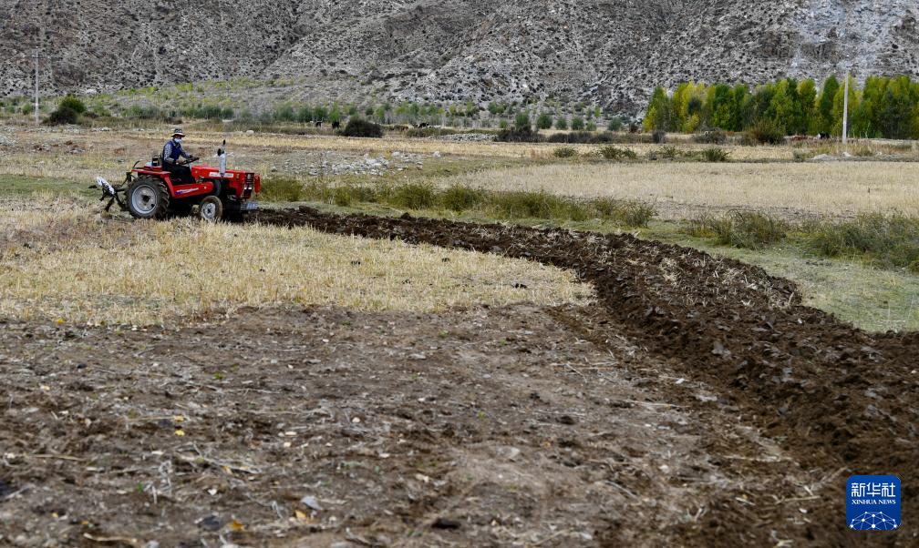 西藏拉薩市達孜區(qū)德慶鎮(zhèn)白納村村民駕駛小型拖拉機犁地(10月11日攝)。新華社記者 張汝鋒 攝