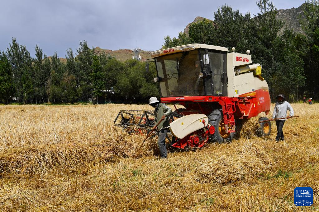 西藏曲水縣才納鄉(xiāng)白堆村村民在高標準化農(nóng)田內(nèi)收獲青稞(9月11日攝)。新華社記者 張汝鋒 攝