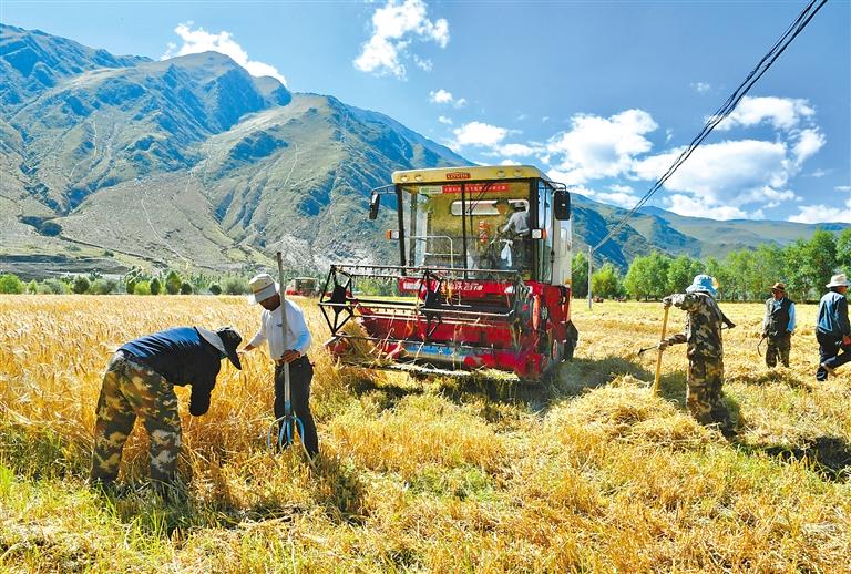 圖為拉薩市達孜區(qū)塔杰鄉(xiāng)巴嘎雪村村民使用大型機械進行收割。記者 旦增蘭澤 攝