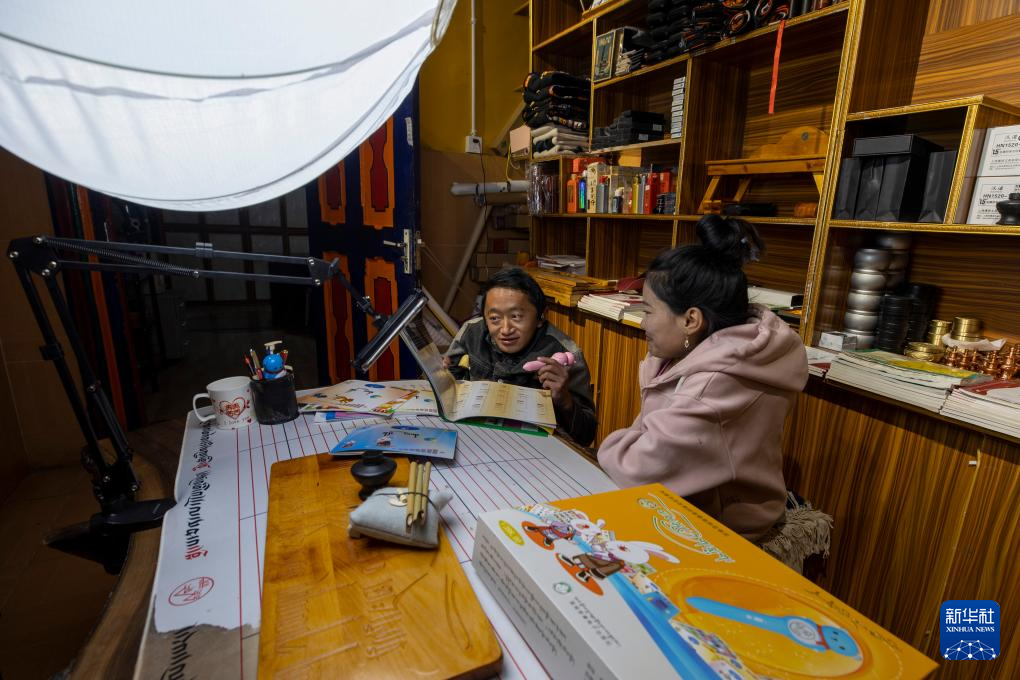 西藏拓崗文化傳播有限公司員工拉巴頓珠(左)與主播索朗德吉合作直播銷(xiāo)售藏語(yǔ)學(xué)習(xí)文具(11月10日攝)。新華社記者 姜帆 攝