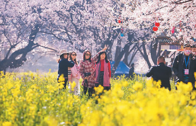 桃花節(jié)期間,游客在嘎拉村桃花源景區(qū)拍照留念。記者 徐馭堯攝