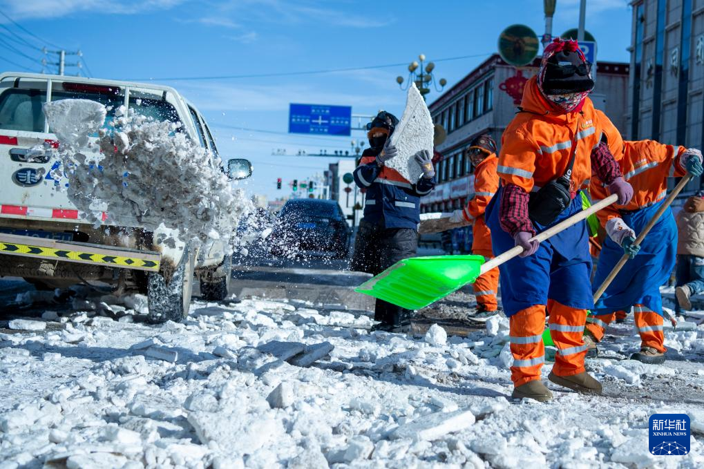 12月15日,環(huán)衛(wèi)工人們在清掃積雪。新華社發(fā)(旦增努布攝)