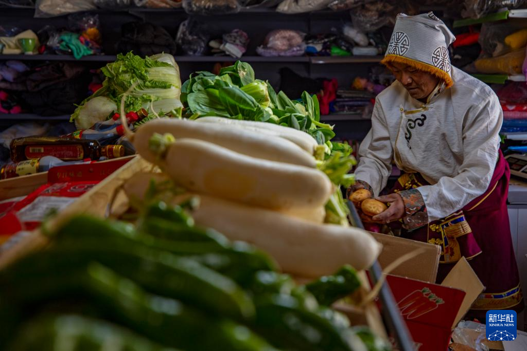 申扎縣馬躍鄉(xiāng)貝嘎四村“偏遠(yuǎn)鄉(xiāng)鎮(zhèn)果蔬配送試點(diǎn)項(xiàng)目”直銷點(diǎn),店主西熱加措在整理供銷社配送來的新鮮蔬菜(1月5日攝)。新華社記者姜帆 攝