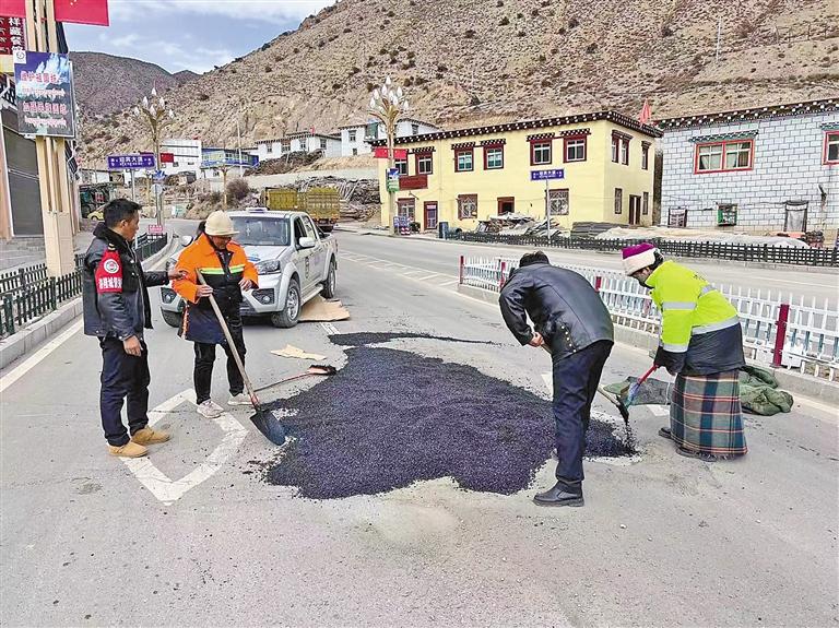 圖為洛隆縣組織公路養(yǎng)護段開展路面修復(fù)工作。記者 貢秋曲措 攝