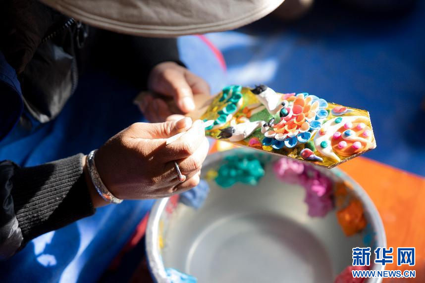圖為西藏現(xiàn)代服務(wù)業(yè)技工學校的學員制作出的卡塞“德格”(1月29日攝)。新華網(wǎng)發(fā) 李騰 攝