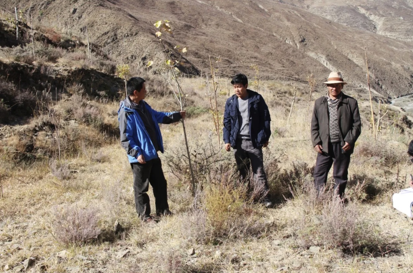 圖為尼瑪次仁(左一)查看樹(shù)苗生長(zhǎng)情況。(圖片由受訪(fǎng)者本人提供)