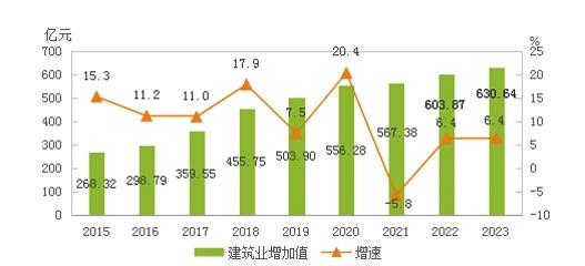 全年建筑業(yè)增加值630.64億元,按可比價計算,比上年增長6.4%。
