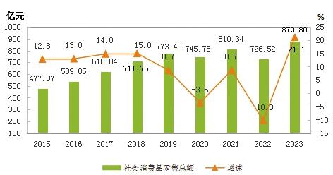 全年社會消費品零售總額879.80億元,比上年增長21.1%。按銷售單位所在地分,城鎮(zhèn)消費品零售額716.67億元,增長19.5%;鄉(xiāng)村消費品零售額163.14億元,增長28.8%。按消費形態(tài)分,商品零售789.54億元,增長19.9%;餐飲收入90.27億元,增長32.4%。