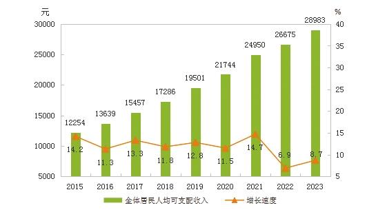 圖12 2015-2023年全體居民人均可支配收入及其增長速度