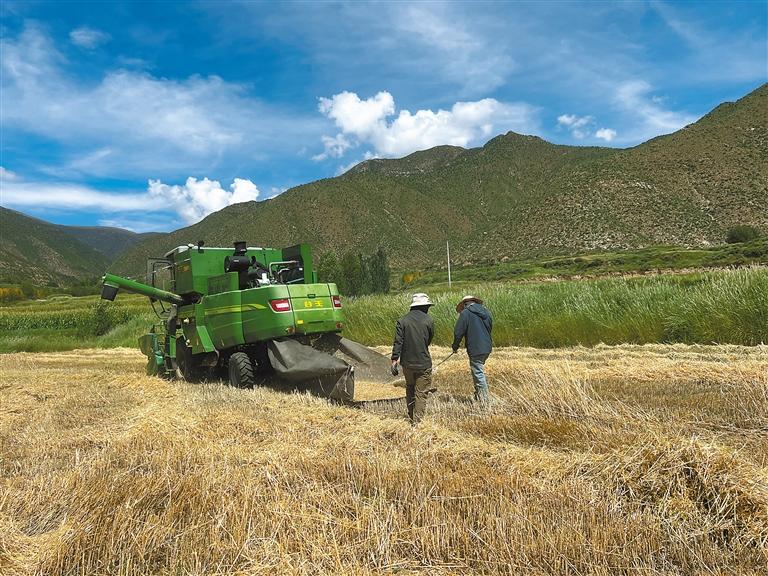 圖為拉薩市堆龍德慶區(qū)古榮護(hù)路大隊(duì)志愿服務(wù)分隊(duì)深入田間地頭,幫助農(nóng)民收割青稞。