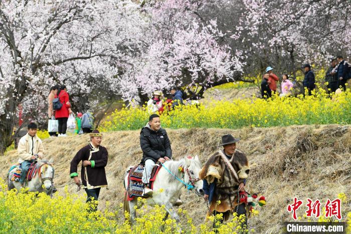 圖為2024年3月31日林芝桃花節(jié)期間,嘎拉村村民帶領(lǐng)游客騎馬賞花。貢嘎來松 攝