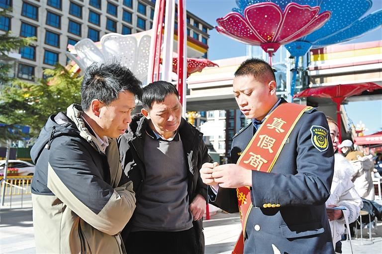 圖為桑珠孜區(qū)市場監(jiān)管局投訴舉報中心負責人李良友(右)向市民講解商品真假辨別方法。記者 扎西頓珠 攝