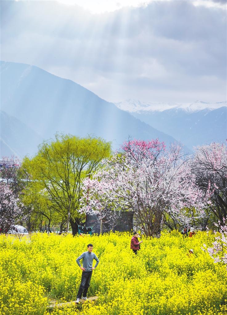 3月29日,游客在林芝市巴宜區(qū)嘎拉村賞花拍照。新華社記者 齊芷玥 攝