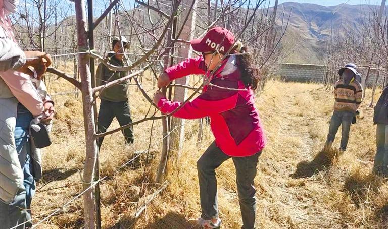 圖為德吉向果農(nóng)演示如何科學(xué)合理修剪蘋果樹。記者 孫開遠(yuǎn) 攝
