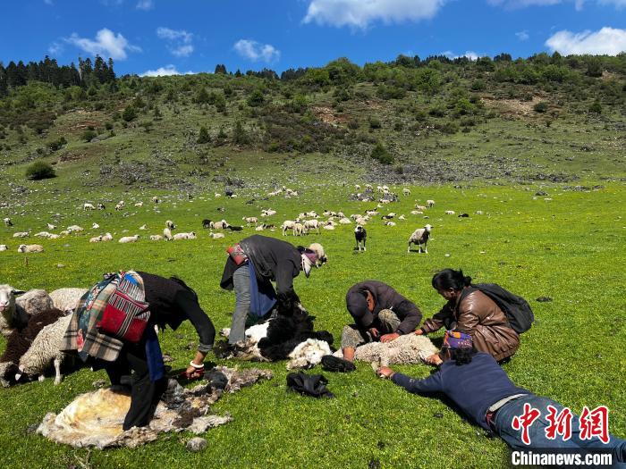 遠(yuǎn)遠(yuǎn)望見(jiàn)多年未見(jiàn)的央宗和定主,原本還在河邊用手機(jī)拍照的阿木姐弟倆直奔過(guò)來(lái)。在剪羊毛的草地上,兩兩同歲的四個(gè)小伙伴邊剪羊毛,邊爭(zhēng)相敘說(shuō)發(fā)生在自己身邊的趣事。