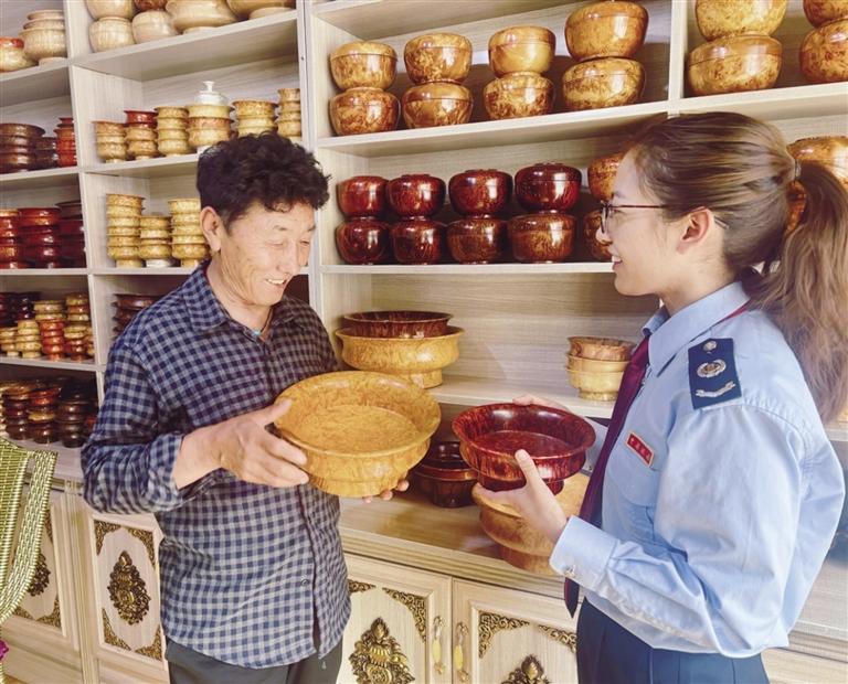 傳承人向稅務(wù)工作人員介紹木碗雕刻工藝。 圖由自治區(qū)稅務(wù)局提供