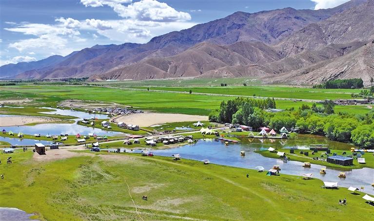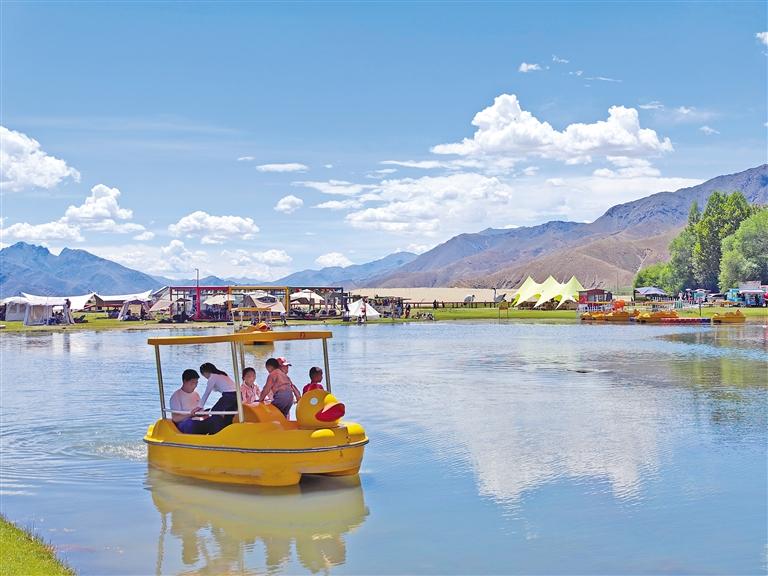 楚貴林卡位于日喀則市桑珠孜區(qū)東嘎鄉(xiāng)楚貴村。2019年初,青島援藏組規(guī)劃盤活村集體用地,打造以自然生態(tài)景觀、休閑度假旅游及異域農(nóng)耕民俗文化體驗(yàn)為主題,融合當(dāng)?shù)匚幕瘍?nèi)涵的“楚貴村生態(tài)旅游度假區(qū)”項(xiàng)目。項(xiàng)目自2022年啟動(dòng)以來,隨著運(yùn)營漸趨成熟,林卡休閑游樂設(shè)施逐年豐富。如今,這里設(shè)有咖啡休閑館、山地摩托、真人CS、游船、騎馬等多個(gè)傳統(tǒng)與現(xiàn)代結(jié)合的項(xiàng)目,受到游客青睞。