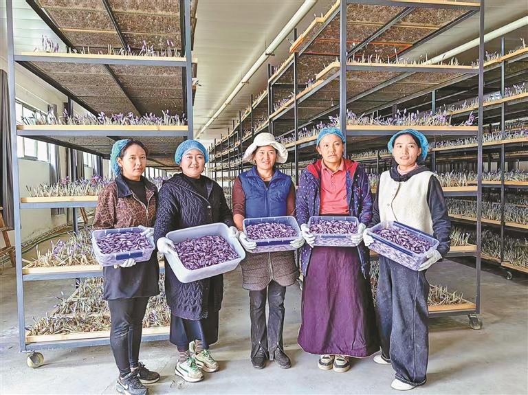“現(xiàn)在是藏紅花開得最繁盛的時候,每天有10多名工人采摘。今年,藏紅花預(yù)估產(chǎn)量有270公斤至300公斤?!绷种ヌ焱r(nóng)牧產(chǎn)品有限公司負責(zé)人陳兵雄介紹說。